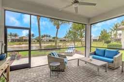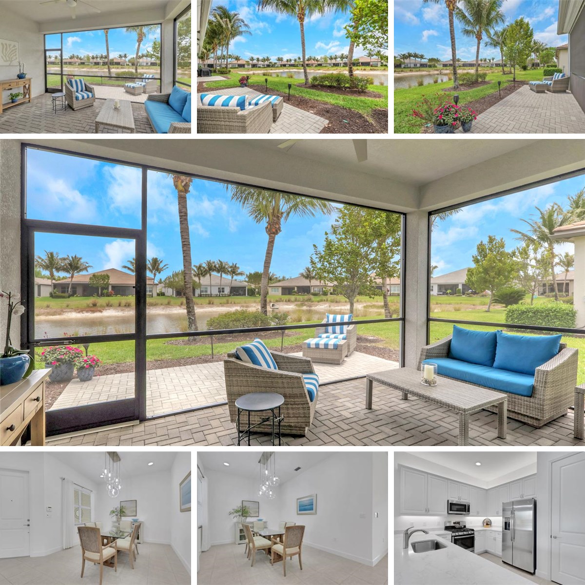 Immaculate “Nantucket” villa in Valencia Bonita, Southwest Florida’s premier 55+ resort-style community. Perfectly positioned on a premium, oversized lakefront lot with an expanded driveway, this residence offers exceptional curb appeal with lush, low-voltage landscape lighting and a welcoming screened entry. Built with IMPACT GLASS throughout, this thoughtfully designed home offers 1,734 square feet under air, featuring 2 bedrooms, 2 baths, a den/office, and a 2-car garage. The private rear screened lanai showcases serene water views—ideal for relaxing or entertaining. The gourmet kitchen is beautifully appointed with quartz countertops, white cabinetry, natural gas cooktop, mosaic tile accents on the peninsula, a glass tile backsplash, and a breakfast bar with seating for four. The open-concept design flows seamlessly into the dining area and great room, highlighted by sliding glass doors leading to the lanai. The primary suite is a true retreat, featuring a coffered ceiling, tranquil lake views, and two spacious walk-in closets with pocket doors. The en-suite bath offers dual vanities with quartz countertops and a walk-in shower with grab bars. Additional highlights include a guest bedroom with walk-in closet, a den/office with French doors, high-hat lighting, and ceiling fans throughout. Valencia Bonita’s 45,000-square-foot clubhouse delivers an unmatched lifestyle with a grand social hall, indoor/outdoor restaurant and bar, spa and nail salon, resort-style pool, lap and resistance pools, cabanas, and a state-of-the-art fitness center. Residents enjoy tennis, pickleball, bocce, a pro shop, dog parks, billiards, card rooms, a pottery studio, cooking studio, and approximately 50 clubs and activities curated by a full-time lifestyle director.
