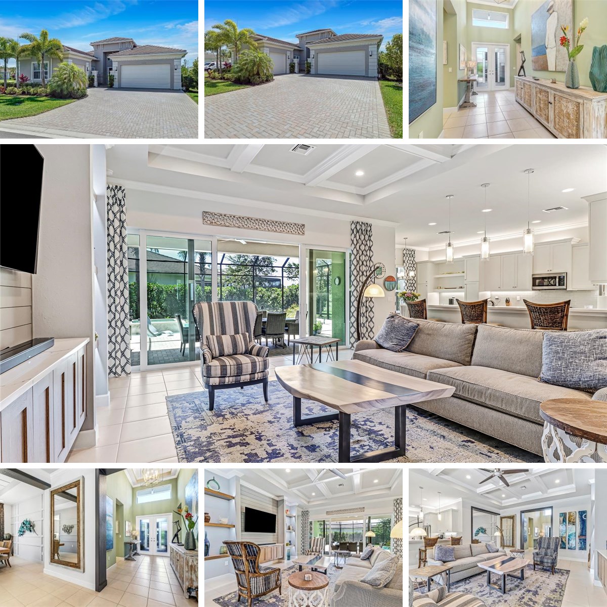 TURNKEY CAROLINE MODEL, Exquisitely Upgraded including impact glass throughout, crown molding, tankless water heater, up lighting under palms & trees front & back, upgraded stunning front doors, gas cooktop, built-in microwave, large pantry, quartz countertops, under & over cabinet lighting, Upgraded washer/dryer, upgraded chandeliers in dining room & kitchen, epoxy flooring in garages, cabinets in garage, heated pool & spa, Outdoor Kitchen w/grill, wine cooler and regular refrigerator, Master bedroom floor upgraded, 2 smart TVs and Bose sound bar in living room, Shiplap/ woodwork in living room dining room and master, Living room wall unit, Valencia Bonita is ideally located, minutes from beaches, fine dining, shopping and more. This 55+ Community has unsurpassed amenities including a 45,000 sq. ft. Clubhouse and Lifestyle Complex with full-time staff providing residents with dining, Broadway-style shows & entertainment, fitness studio, nail salon & spa, resort, lap and resistance pools, pickle ball, tennis, bocci, and dog park.